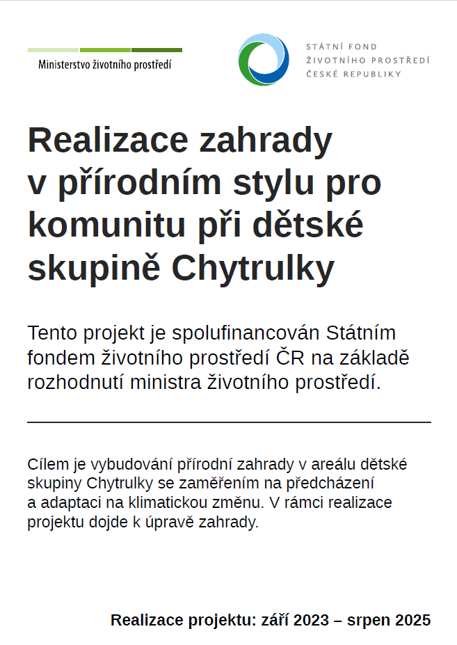 V naší dětské skupině proběhla v roce 2024 rekonstrukce zahrady za finanční podpory Státního fondu životního prostředí, kterou schválilo Ministerstvo životního prostředí. Tato přírodní zahrada slouží dětem i rodičům k environmentálnímu vzdělávání a výchově. Děti tak mají možnost poznávat některé přírodní zákonitosti, děje a jevy a učí se přímým sledováním a praktickými činnostmi vztahu k přírodě.